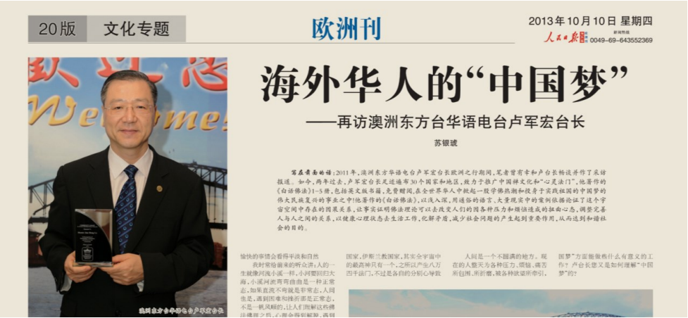 他领导下的澳洲东方华语电台同样心系祖国,他们与中央人民广播电台签署了合作协议,让海外华人第一时间听到了来自祖国的声音;长江洪灾、汶川、雅安地震时,电台主持人和听众踊跃捐款,得到中国民政部门的嘉奖。他让世界欣赏、体悟、接受中国博大精深的佛教文化,使当代中国精神和价值观为世界所认识和接受。他倡导的心灵法门也肩负着担任国家文化走向世界的和平使者职责,在中华佛教文化与不同文明之间的沟通与交流过程中,传播正法,广结善缘,对推进中华优秀文明走向世界做出杰出贡献。近年来,台长受全世界三十多个国家和地区邀请,举办约五十场《玄艺综述解答会》,弘法足迹遍及欧亚,因此荣获联合国授予文化教育大使、世界宗教联合大会授予世界和平大使、世界和平奖(佛教),以及英国国会上议院颁发的英联邦民族社区特别贡献奖等多项殊荣,并登上了世界学术巅峰哈佛大学的讲坛;卢军宏台长更是受到祖籍国国家主席江泽民、胡锦涛和李克强总理的接见,并荣登中国新闻出版署发行的2014年度《中国人年鉴》,中国网、人民网以及人民日报海外版、凤凰卫视等曾作专题采访报道;2015年5月,台长作为亚太资讯与传媒联盟执行副主席和佛教大德居士,以特邀嘉宾身份参加了泰国首都曼谷举办的第十二届“联合国卫塞节”庆典暨国际佛教大会,倡导用佛法圆融智慧,应对当下世界文化冲突,共谋人类社会的和平与福祉。